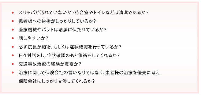 しかし、交通事故治療(むち打ち治療)をどこで受けるのかを安易に決めることはおすすめしません。